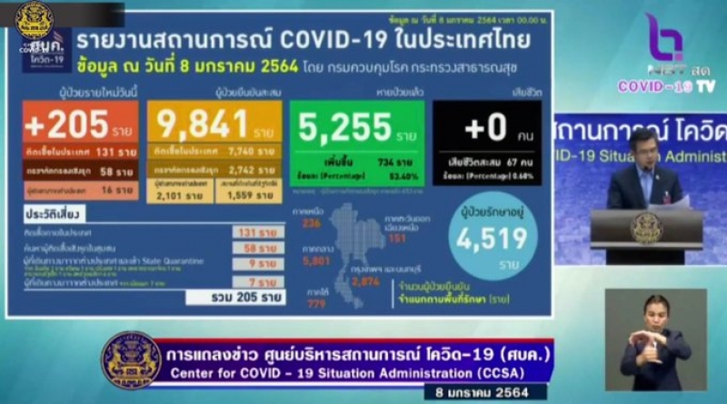 วันที่ 8 ม.ค.64 ศบค.แถลงไทยพบติดรายใหม่ 205 ราย ติดในประเทศ 131 ราย คัดกรองเชิงรุก 58 ราย และเข้า SQ 16 ราย รวม ผู้ติดสะสม 9,841 ราย หายสะสม 5,255 ราย รักษาสะสม 4,519 ราย สะสม 67 ราย