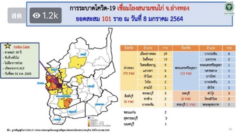 โดยความคืบหน้าล่าสุดในวันที่ 8 ม.ค.64 นพ.โสภณ เอี่ยมศิริถาวร ผู้อำนวยการกองโรคติดต่อทั่วไป ปฏิบัติหน้าที่รองอธิบดีกรมควบคุมโรค เปิดเผยกรณีสนามชนไก่ ที่จังหวัดอ่างทอง ล่าสุดมีผู้ติดเชื้อเพิ่มเป็น 101 รายใน 8 จังหวัด ประกอบด้วย อ่างทอง 70 ราย พระนครศรีอยุธยา 13 ราย สิงห์บุรี 6 ราย ลพบุรี 5 ราย สุพรรณบุรี 3 ราย ขอนแก่น 2 ราย สระบุรี 1 ราย และนนทบุรี 1 ราย