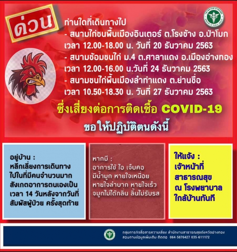 กรณีสำนักงานสาธารณสุขจังหวัดอ่างทอง ออกประกาศ ได้ขอความร่วมมือผู้ที่ไปสนามชนไก่ เเละสนามซ้อมชนไก่ทุกเเห่งทุกอำเภอในจังหวัด ตั้งเเต่วันที่ 18ธ.ค.63 ให้ติดต่อโรงพยาบาลใกล้บ้านเพื่อรับการคัดกรอง เนื่องจากขณะนี้มีประชาชนติดโควิด-19จากบ่อนชนไก่เเละสนามซ้อมไก่ชนเป็นจำนวนมาก