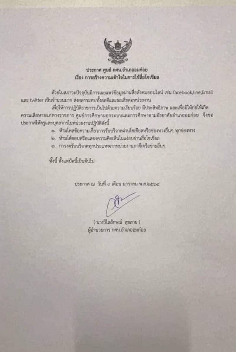 ต่อมา ศูนย์ กศน.อมก๋อย ได้ออกหนังสือราชการประกาศ ลงวันที่ 9 ม.ค. 2564 เรื่อง การสร้างความเข้าใจในการใช้สื่อโซเชียลในการสื่อสาร โดยมีใจความสำคัญ ดังนี้