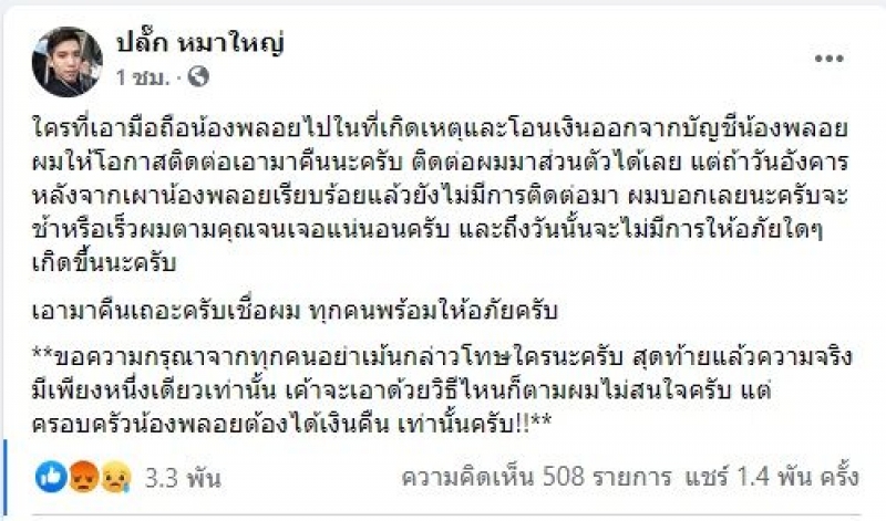 ใครที่เอามือถือน้องพลอยไปในที่เกิดเหตุและโอนเงินออกจากบัญชีน้องพลอย ผมให้โอกาสติดต่อเอามาคืนนะครับ ติดต่อผมมาส่วนตัวได้เลย แต่ถ้าวันอังคาร แล้วยังไม่มีการติดต่อมา ผมบอกเลยนะครับจะช้าหรือเร็วผมตามคุณจนเจอแน่นอนครับ และถึงวันนั้นจะไม่มีการให้อภัยใดๆ เกิดขึ้นนะครับ