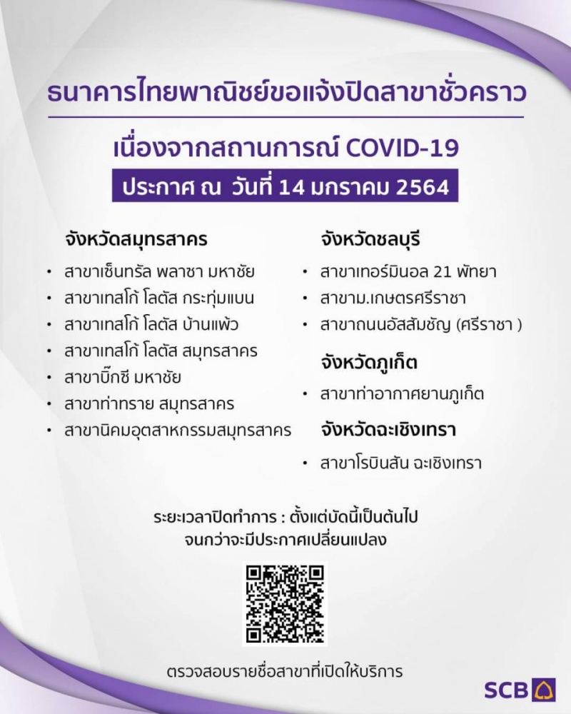 แจ้งเลื่อนเวลาปิดทำการสาขาในห้างสรรพสินค้าทั่วประเทศเป็นเวลา 18.00 น. ตั้งแต่ 4 มกราคม 2564 เป็นต้นไป (จนกว่าจะมีประกาศเปลี่ยนแปลง)