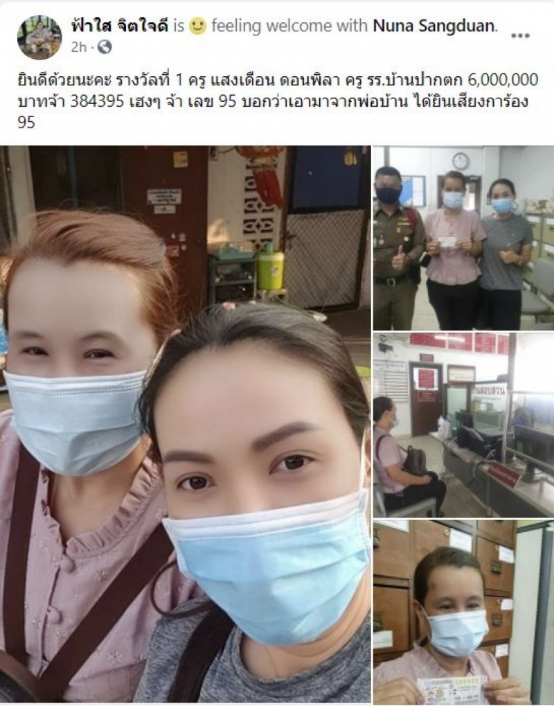 ล่าสุดผู้ใช้เฟซบุ๊ค ฟ้าใส จิตใจดี ได้เผยข่าวดีของคนดวงเฮง ต้อนรับการออกรางวัลสลากกินเเบ่งรัฐบาลเเรกของปี 2564 ยินดีด้วยนะคะ ถูกลอตเตอรี่รางวัลที่ 1 ครูแสงเดือน ดอนพิลา ครู รร.บ้านปากตก 6,000,000 บาทจ้า กับหมายเลข 384395 จ้า เลข 95 บอกว่าเอามาจากพ่อบ้าน ได้ยินเสียงการ้อง 95