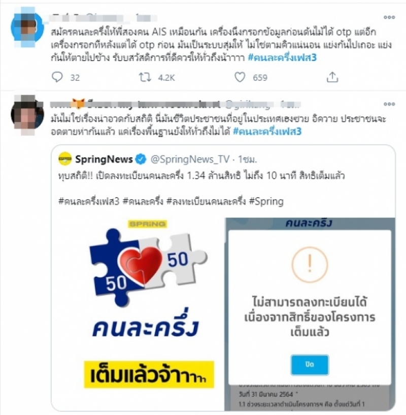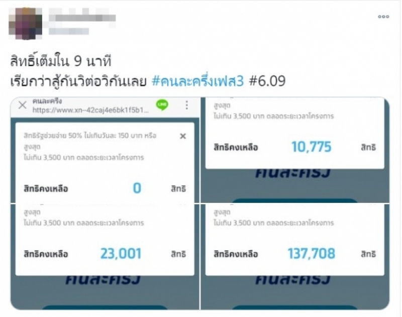 ขณะที่โลกออนไลน์ก็เกิดการวิพากษ์วิจารณ์ ส่งผลให้ #คนละครึ่งเฟส3 พุ่งติดเทรนด์ทวิตเตอร์อย่างรวดเร็ว เกิดปัญหา รหัส OTP ส่งล่าช้า ทำให้หลายคนที่รอ ก็ชวดลงทะเบียนสำเร็จ