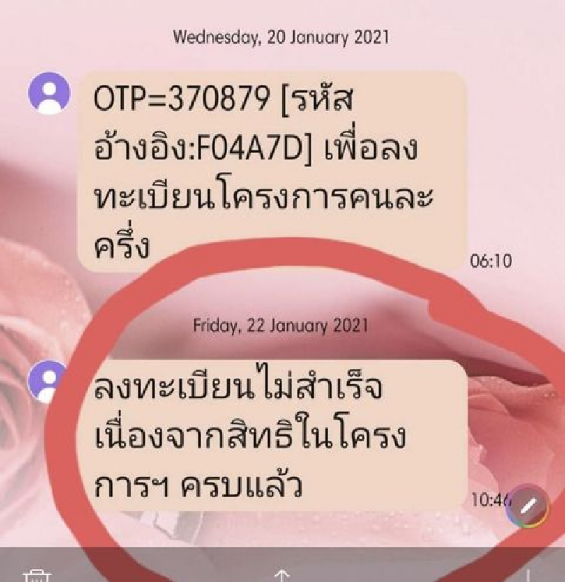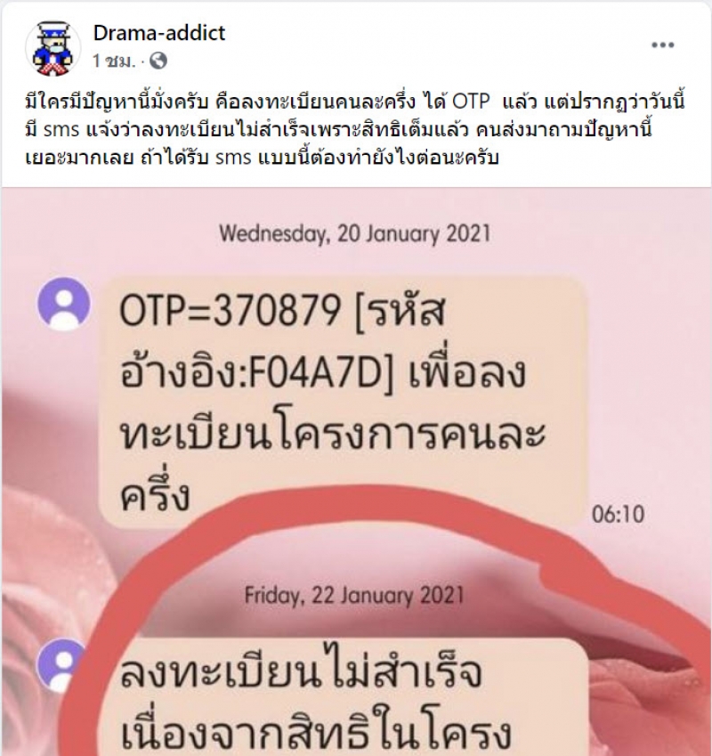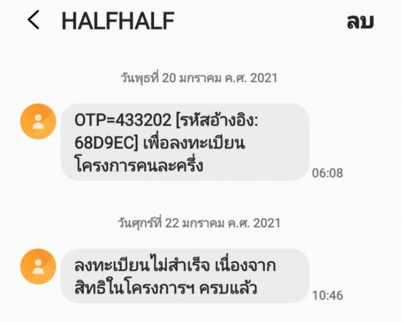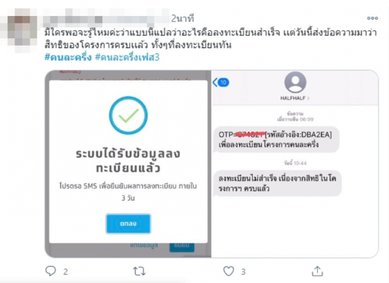 มีใครมีปัญหานี้มั่งครับ คือลงทะเบียนคนละครึ่ง ได้ OTP แล้ว แต่ปรากฏว่าวันนี้มี sms แจ้งว่าลงทะเบียนไม่สำเร็จเพราะสิทธิเต็มแล้ว คนส่งมาถามปัญหานี้เยอะมากเลย ถ้าได้รับ sms แบบนี้ต้องทำยังไงต่อนะครับ