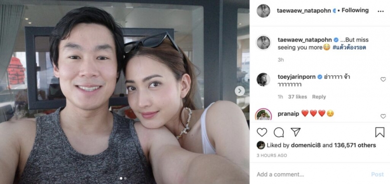 ซึ่งก่อนหน้านี้ทางด้าน แต้ว ณฐพร ได้ออกมาโพสต์รูปภาพคู่กับแฟนหนุ่ม ไฮโซณัย ซึ่งเป็นภาพเก่า พร้อมกับระบุแคปชั่นสุดอ้อนว่า .But miss seeing you more แต่ฉันคิดถึงคุณมาก