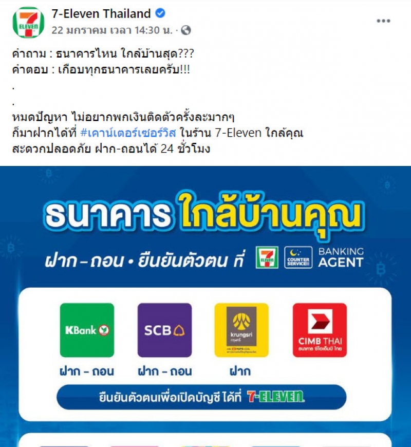 เมื่อวันที่ 22 มกราคม 64 ทางด้านเพจเฟสบุ๊ก 7-Eleven Thailand ได้โพสต์แจ้งข่าวว่ามีบริการฝาก-ถอน ที่ 7-Eleven ได้แล้ว โดยทางเพจระบุว่า