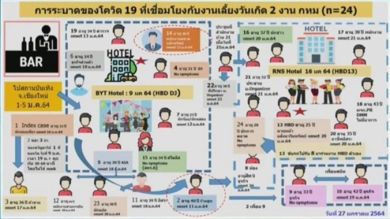 เมื่อวันที่ 28 ม.ค.64 พญ.อภิสมัย ศรีรังสรรค์ ผู้ช่วยโฆษกศูนย์บริหารสถานการณ์cv(ศบค.) เปิดเผยถึงกรณี คลัสเตอร์การติดเชื้อจากงานวันเกิด ดีเจมะตูม รายงานการสอบสวนผู้ที่เกี่ยวข้องกับดีเจมะตูม ติดทั้งสิ้น นับถึงวันที่ 27 ม.ค. ทั้งสิ้น 24 ราย นี่คือตัวเลขทางการ แต่ไม่เป็นทางการจะมีเพิ่มอีก 2 ราย ยังไม่นับรวมผู้สัมผัสเสี่ยงสูงอีก 113 ราย ผู้สัมผัสเสี่ยงต่ำอีก 53 ราย ซึ่งจะทยอยรายงานต่อเนื่องในสัปดาห์นี้