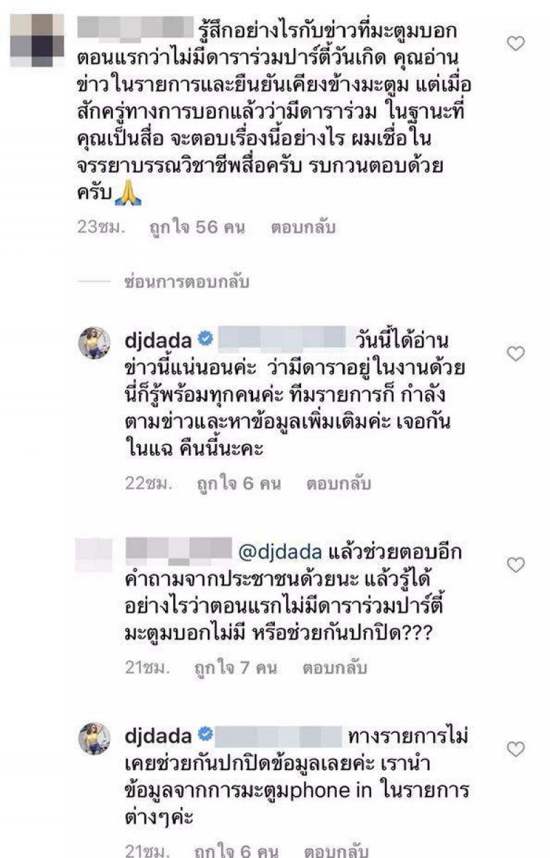 จากนั้น ดีเจดาด้า จึงได้ตอบว่า วันนี้ได้อ่านข่าวนี้แน่นอนค่ะ ว่ามีดาราอยู่ในงานด้วย นี่ก็รู้พร้อมทุกคนค่ะ ทีมรายการก็กำลังตามข่าวและหาข้อมูลเพิ่มเติมค่ะ เจอกันในแฉ คืนนี้นะคะ และชาวเน็ตก็ถามต่อว่า แล้วช่วยตอบอีกคำถามจากประชาชนด้วยนะ แล้วรู้ได้อย่างไรว่าตอนแรกไม่มีดาราร่วมปาร์ตี้ มะตูมบอกไม่มี หรือ ช่วยกันปกปิด