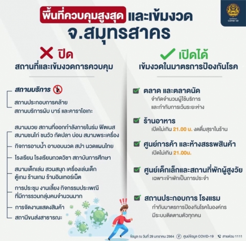สำหรับสมุทรสาคร เป็นพื้นที่ควบคุมสูงสุด และเข้มงวด โดย ให้เปิด ตลาดและตลาดนัดได้ แต่จำกัดจำนวนผู้ใช้บริการ ร้านอาหารเปิดได้ไม่เกิน 21.00 น. ศูนย์การค้าและห้างสรรพสินค้า เปิดไม่เกิน 21.00 น. และศูนย์เด็กเล็กและสถานที่พักผู้สูงวัย เฉพาะเข้าพักเป็นประจำ ส่ววนสถานประกอบการโรงแรม ให้กำกับมาตรการป้องกัน ส่วนสถานที่อื่นๆ ยังปิดให้บริการ