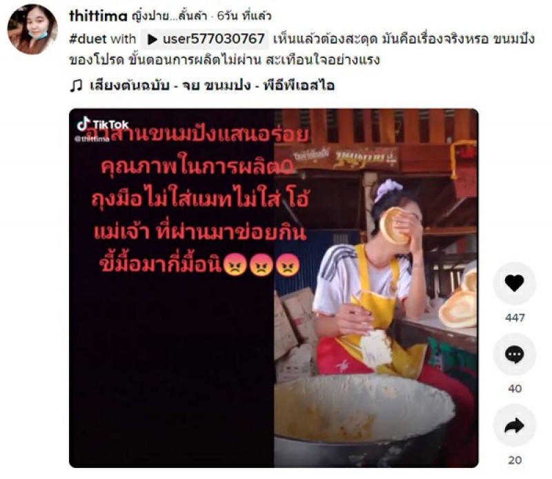 ต้องบอกเลยว่าเป็นอีกหนึ่งคลิปที่โซเชียลเข้ามาแสดงความเห็น และให้ความสนใจกันเป็นสจำนวนมาก หลัง ผู้ใช้ tiktok บัญชี thittima ได้มีการเผยแพร่คลิปวีดิโอถึงขั้นตอนการทำขนมปังของร้านแห่งหนึ่ง ที่ไม่มีสุขอนามัย ไม่มีการสวมใส่ถุงมือขณะจับขนมปัง และยังมีการพูดคุยหัวเราะกันโดยไม่มีสวมหน้ากากอนามัยปิดปากอีกด้วย