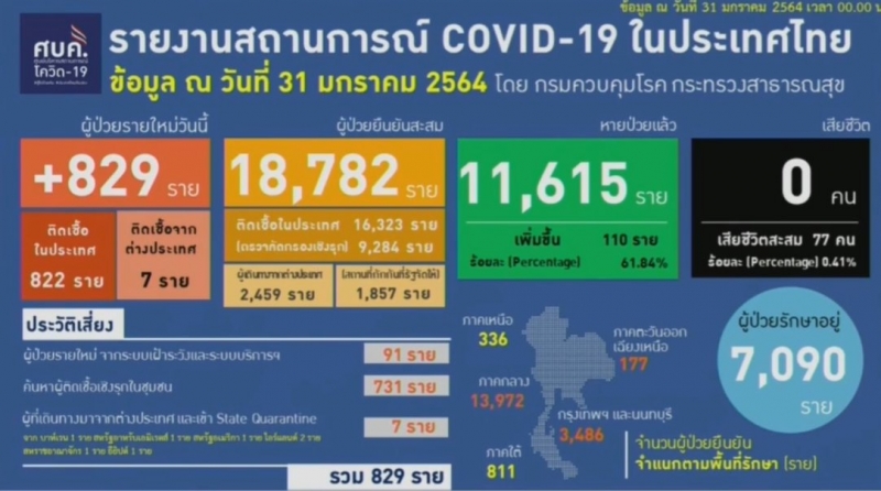 ศบค.เผย 31 ม.ค. ติดใหม่ 829 ราย สะสมใกล้แตะ 2 หมื่น