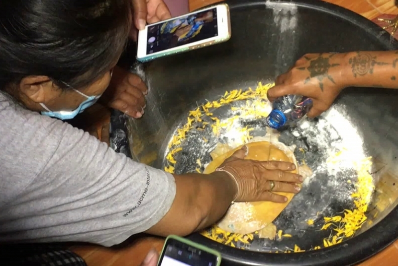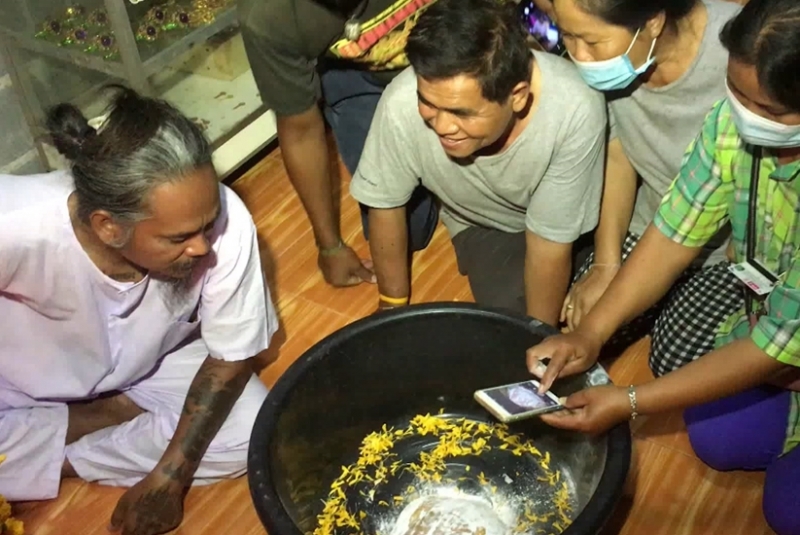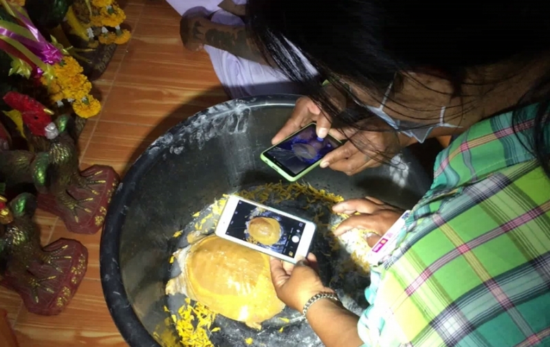 จากนั้นก็จะช่วยกันส่องหาเลข ที่ปรากฏบนตัวของตะพาบ บางคนก็ใช้โทรศัพท์ มือถือ ในการบันทึกภาพ เอาไว้ เพราะถือเป็นของแปลก ที่ละแวกนี้ไม่เคยมีคนพบเห็นตะพาบ ที่ลำตัวออกสีเหลืองทอง มาก่อน