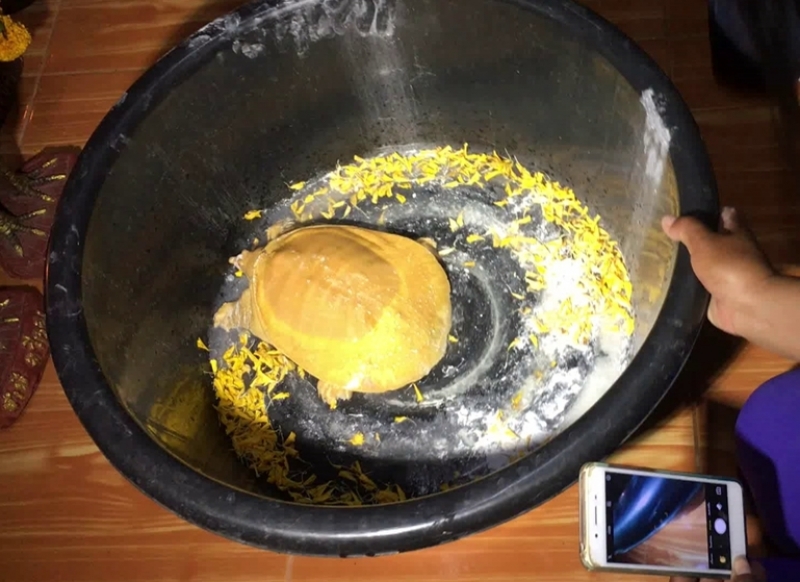 ซึ่งก่อนหน้านี้ได้มีการทำพิธีตั้งขันธ์ 5 ตามความเชื่อ เพื่อขอ โช ค จากตะพาบน้ำสีทองตัวดังกล่าว โดยทำการนำตะพาบใส่ในภาชนะ แล้วโรยด้วยดอกดาวเรืองรอบๆ ตัวของตะพาบ จากนั้นชาวบ้าน ได้นำแป้งฝุ่น มาโรยลงบนตัวตะพาบน้ำ โดยวิธีการคือใช้มือลูบขึ้น และคนที่ลูบหาเลข เอง จะต้องเป็นคนเกิดวันอังคาร