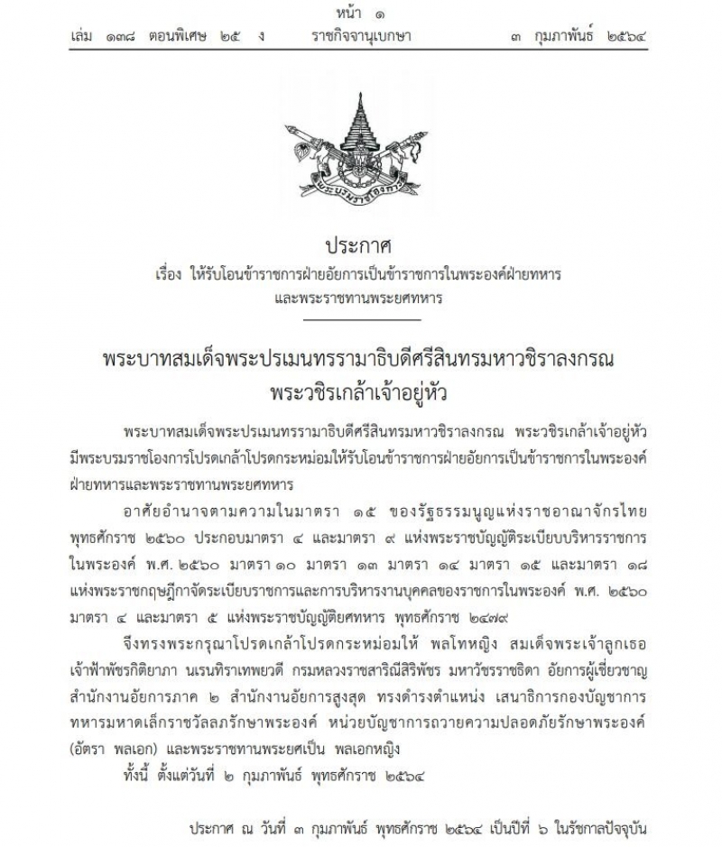 เมื่อวันที่ 3 กุมภาพันธ์ 2564 ราชกิจจานุเบกษา เผยแพร่ ประกาศ เรื่อง ให้รับโอนข้าราชการฝ่ายอัยการเป็นข้าราชการในพระองค์ฝ่ายทหาร และ พระราชทานยศทหาร โดยว่า