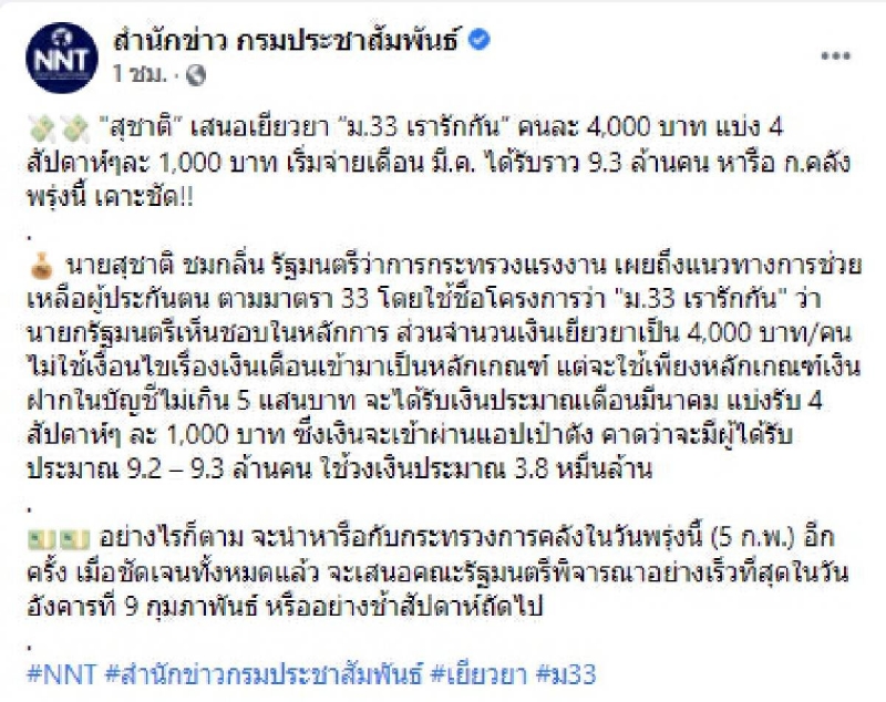 วันนี้ ( 4 กุมภาพันธ์ 2564 ) ที่เพจ สำนักข่าว กรมประชาสัมพันธ์ ได้มีการโพสต์ข้อความระบุว่า สุชาติ เสนอเยียวยา ม.33 เรารักกัน คนละ 4,000 บาท แบ่ง 4 สัปดาห์ๆละ 1,000 บาท เริ่มจ่ายเดือน มี.ค. ได้รับราว 9.3 ล้านคน หารือ ก.คลัง พรุ่งนี้ เคาะชัด
