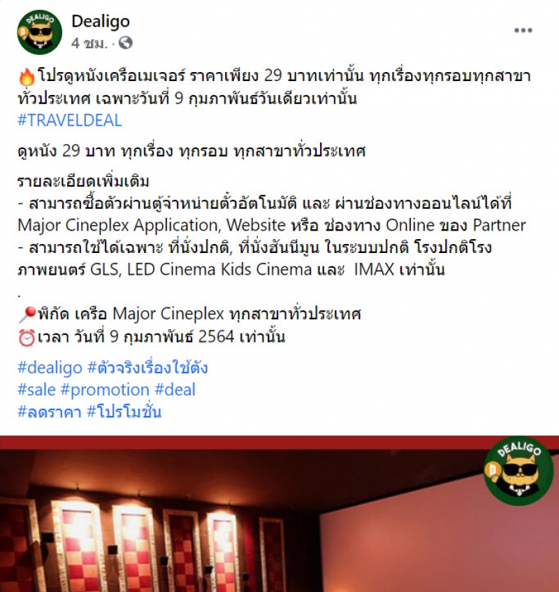 วันนี้เรามีโปรโมชั่นดีๆมาฝากกันค่ะ กับโปรโมชั่นดูภาพยนตร์ในเครือเมเจอร์ซีนีเพล็กซ์ ราคาตั๋วแค่ 29 บาท วันที่ 9 ก.พ. 64 เท่านั้น โดยเฟซบุ๊กเพจ Deagilo ได้เผยภาพ พร้อมระบุว่า...