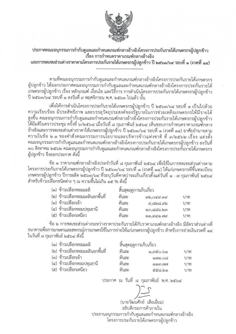กรมการค้าภายใน ออกประกาศคณะอนุกรรมการกำกับดูแลและกำหนดเกณฑ์กลางอ้างอิงโครงการประกันรายได้เกษตรกรผู้ปลูกข้าว เรื่องกำหนดราคาเกณฑ์กลางอ้างอิง และการชดเชยส่วนต่างราคาตามโครงการประกันรายได้เกษตรกรผู้ปลูกข้าว ปี 2563/64 รอบที่ 1 (งวดที่ 14) ความว่า