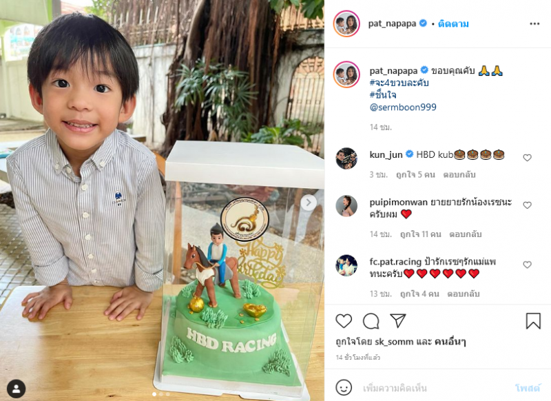 ล่าสุดสาวแพท ณปภา อดีตภรรยา ได้เคลื่อนไหวผ่านไอจี โดยได้โพสต์ภาพน้องเรซซิ่ง พร้อมกับระบุข้อความว่า ขอบคุณคับ #จะ4ขวบละคับ #ชื่นใจ