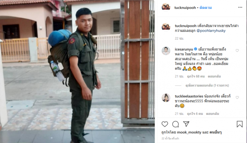 ทั้งนี้ล่าสุดทำเอาคนเแป็นแม่ อย่าง ตั๊ก ศิริพร ถึงกับตกใจแรง เมื่อเห็นภาพบุตรชายกลับมาจากเข้าฝึกภาคสนาม รด ที่ค่ายเขาช นไก่ พร้อมข้อความระบุว่า เพิ่งกลับมาจากเขาชนไก่ดำกว่าแม่เลย poohlarryhusky ที่งานนี้เหล่าแฟนคลับ พร้อมเพื่อนในวงการแห่คอมเม้นต์ชื่นชม น้องภูกันอย่างล้นหล้ามเลยทีเดียว