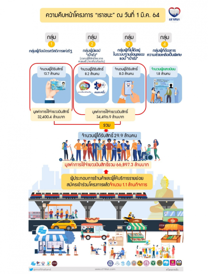 หรือสำหรับลุงป้าน้าอาที่ถือบัตรสวัสดิการแห่งรัฐหรือบัตรคนจน ก็ได้ใช้จ่ายกับวงเงินยาวๆไปที่เรียบร้อยแล้ว แล้วสำหรับกลุ่มประชาชนที่ต้องการความช่วยเหลือเป็นพิเศษนะ ก็สามารถลงทะเบียนเข้าร่วมโครงการเราชนะได้ตั้งแต่วันนี้