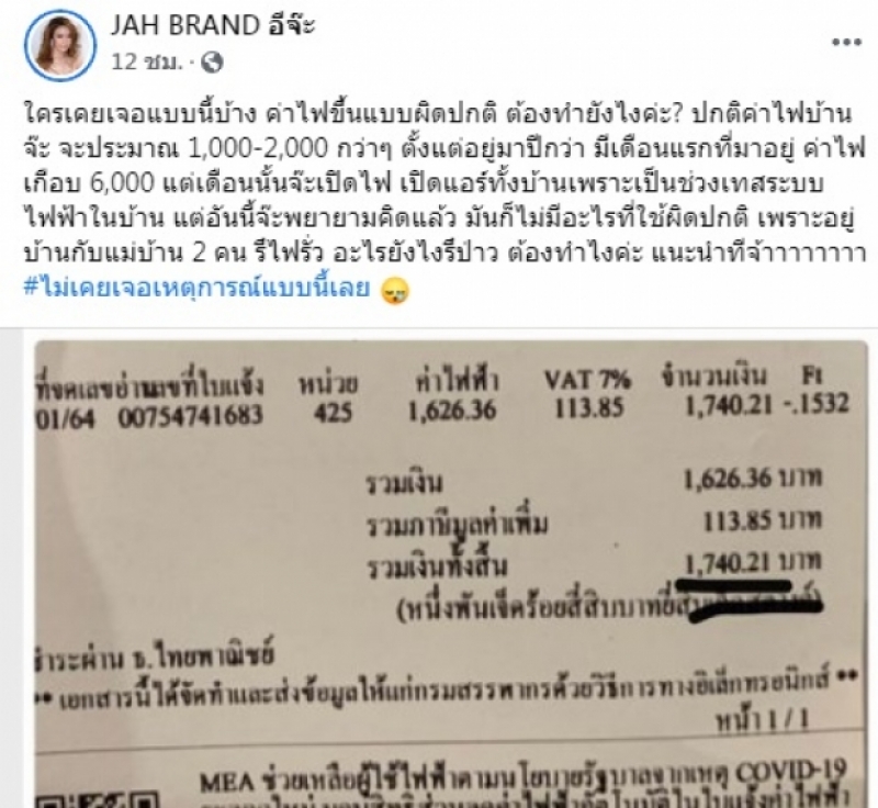 ล่าสุด ถึงกับปรี๊ดแตกเลยล่ะค่ะ เมื่อ นักร้องสาวจ๊ะ อาร์สยาม ได้โพสต์บิลล์ค่าไฟฟ้า เมื่อเดือน กุมภาพันธ์ พร้อมข้อความว่า