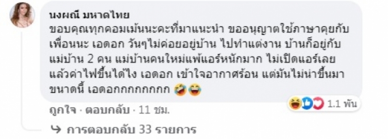 ขอบคุณทุกคอมเม้นนะคะที่มาแนะนำ ขออนุญาตใช้ภาษาคุยกับเพื่อนนะ เอดอก วันๆไม่ค่อยอยู่บ้าน ไปทำแต่งาน บ้านก็อยู่กับแม่บ้าน 2 คน แม่บ้านคนใหม่แพ้แอร์หนักมาก ไม่เปิดแอร์เลย แล้วค่าไฟขึ้นได้ไง เอดอก เข้าใจอากาศร้อน แต่มันไม่น่าขึ้นมาขนาดนี้