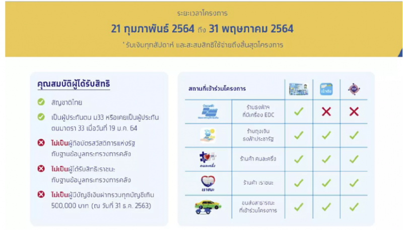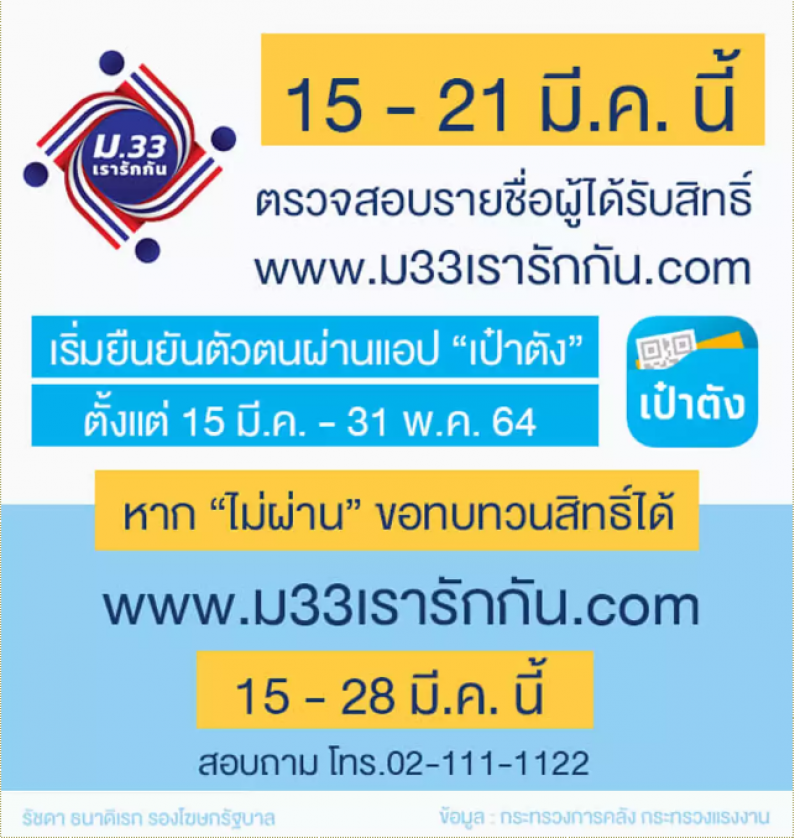 โครงการ คนละครึ่ง โครงการ เราชนะ วันที่ 12 เมษายน-31 พฤษภาคม 2564หากผู้ประกันตนมาตร 33 ที่ลงทะเบียนแล้ว แต่ไม่ผ่านการคัดกรอง สามารถขอทบทวนสิทธิ์ผ่านเว็บไซต์ www.ม33เรารักกัน.com