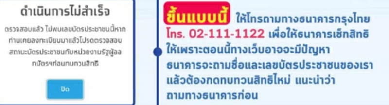 2.ดำเนินการไม่สำเร็จ ตรวจสอบแล้ว ไม่พบเลขบัตรประชาชนนี้หากท่านเคยลงทะเบียนมาแล้วโปรดตรวจสอบสถานะบัตรประชาชนกับหน่วยงานรัฐผู้ออกบัตรก่อนทบทวนสิทธิ หากขึ้นแบบนี้ ให้โทรถามทางธนาคารกรุงไทย โทร 02-111-1122 เพื่อให้ธนาคารเช็กสิทธิให้เพราะตอนนี้ทางเว็บอาจจะมีปัญหาธนาคารต้องกดทบทวนสิทธิใหม่ แนะนนำว่าถาามทางธนาคารก่อน