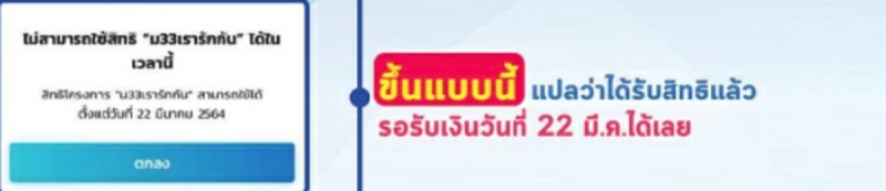 1.ไม่สามารถใช้สิทธิ ม33เรารักกัน ได้ในเวลานี้ สิทธิโครงการ ม33เรารักกัน สามารถใช้ได้ตั้งแต่วันที่ 22 มีนาคม 2564 หากขึ้นแบบนี้ แปลว่าได้รับสิทธิแล้วรอรับเงินวันที่ 22 มีนาคม ได้เลย