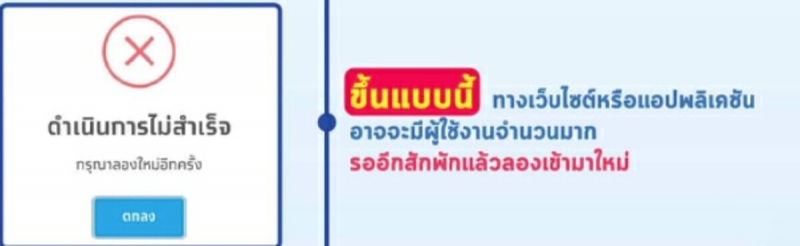 3.ดำเนินการไม่สำเร็จ กรุณาลองใหม่อีกครั้ง หากขึ้นแบบนี้ ทางเว็บไซต์หรือแอปพลิเคชันอาจจะมีผู้ใช้งานจำนวนมาก รออีกสักพักแล้วลองเข้ามาใหม่