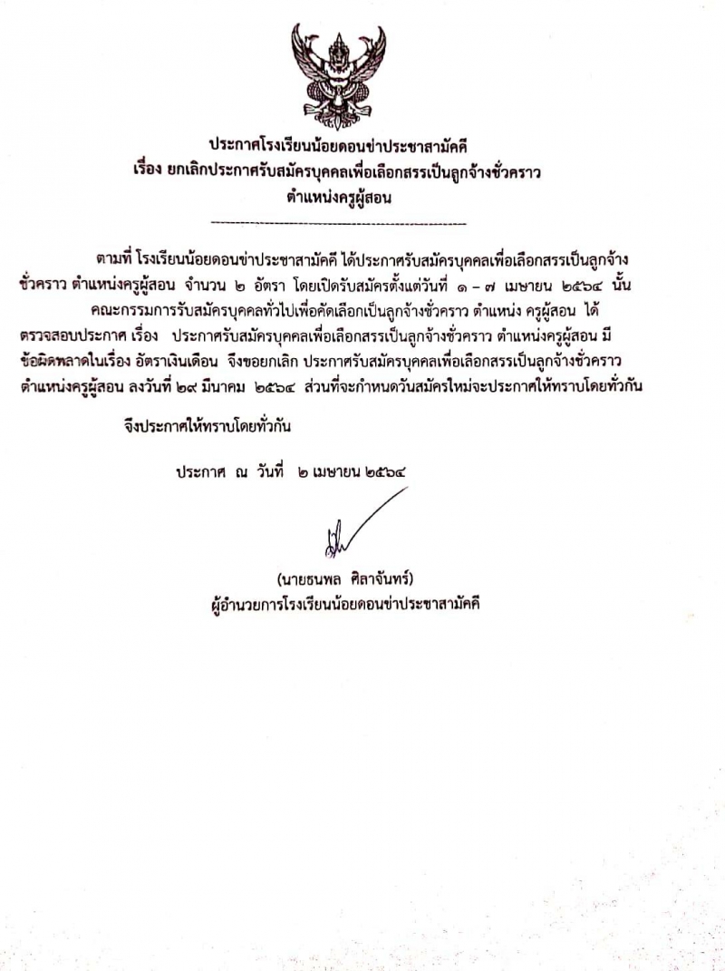 ด้าน นายธนพล ศิลาจันทร์ ผู้อำนวยการโรงเรียนน้อยดอนข่าประชาสามัคคี อ.ฆ้องชัย จ.กาฬสินธุ์ ได้ยกเลิกประกาศรับสมัครบุคคลเพื่อเลือกสรรเป็นลูกจ้างชั่วคราว ตำแหน่งครูผู้สอน เมื่อวันที่ 2 เม.ย.64 ที่ผ่านมา ส่วนการกำหนดวันสมัครใหม่นั้น จะแจ้งให้ทราบอีกครั้ง
