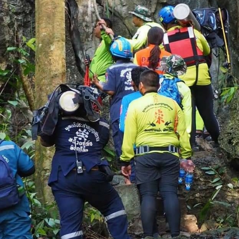 ต่อมาเวลาประมาณ 17.00 น. เจ้าหน้าที่กู้ภัยเดินทางพร้อมถังออกซิเจนและอุปกรณ์นำทาง เข้าไปค้นหาภายในถ้ำเป็นครั้งแรก