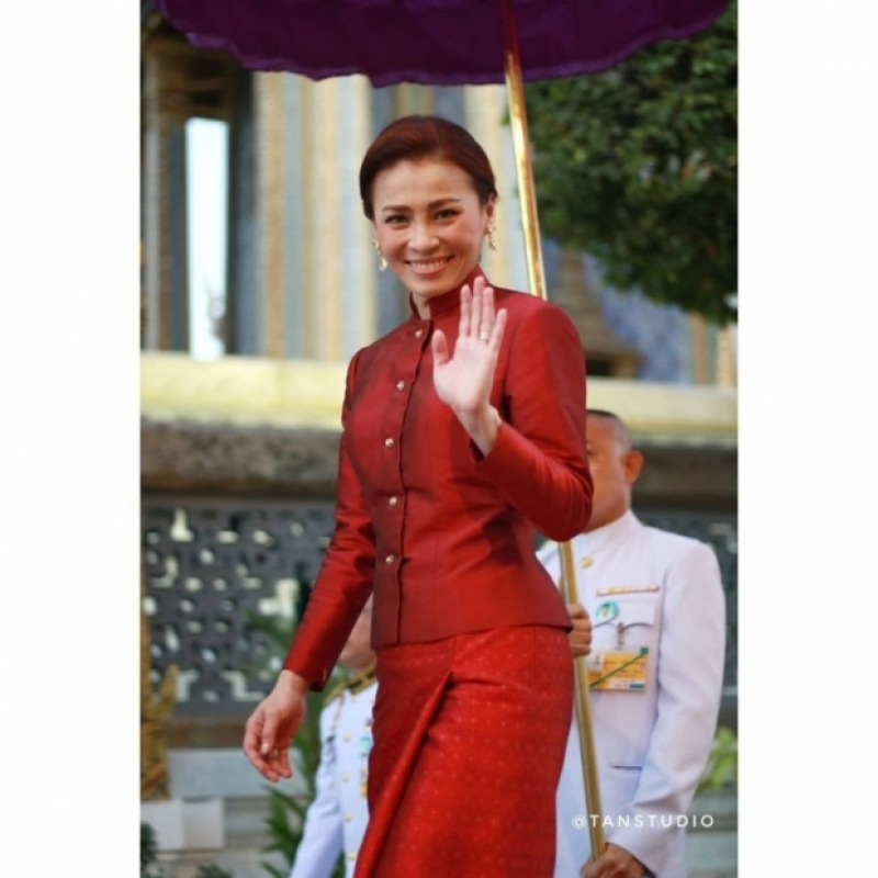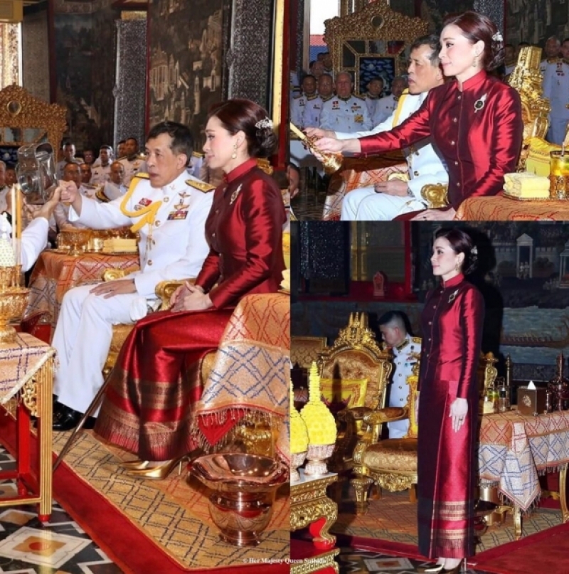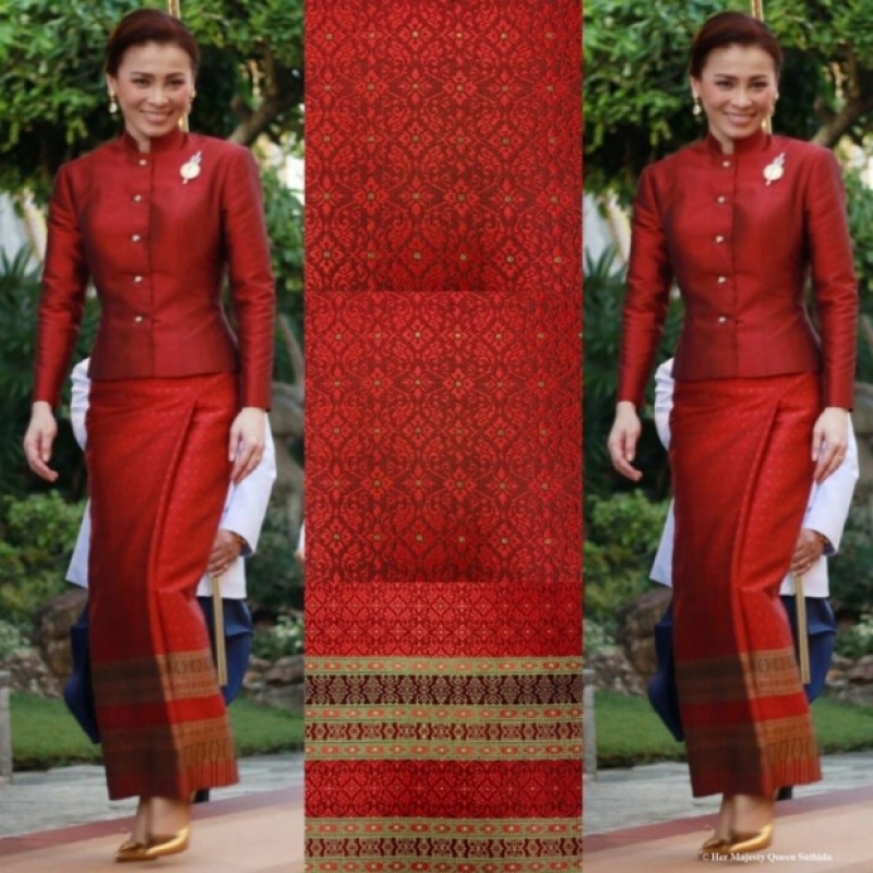 สมเด็จพระนางเจ้าสุทิดา พัชรสุธาพิมลลักษณ พระบรมราชินี ทรงสวมใส่ฉลองพระองค์ชุดไทยอมรินทร์สีแดง พระภูษาตัดเย็บจากผ้ายกไหมลายเถากระดังงาสีแดง โดยสังเกตได้ว่า สมเด็จพระนางเจ้าสุทิดา พัชรสุธาพิมลลักษณ พระบรมราชินี ทรงสวมใส่ฉลองพระองค์สีแดงเช่นนี้ไม่บ่อยครั้งนัก และ พบว่า การทรงพระภูษาสีแดงในวันพระของเจ้านาย เป็นหนึ่งในธรรมเนียมของราชสำนักไทยที่มีมาตั้งแต่รัชสมัยพระบาทสมเด็จพระจอมเกล้าเจ้าอยู่หัว