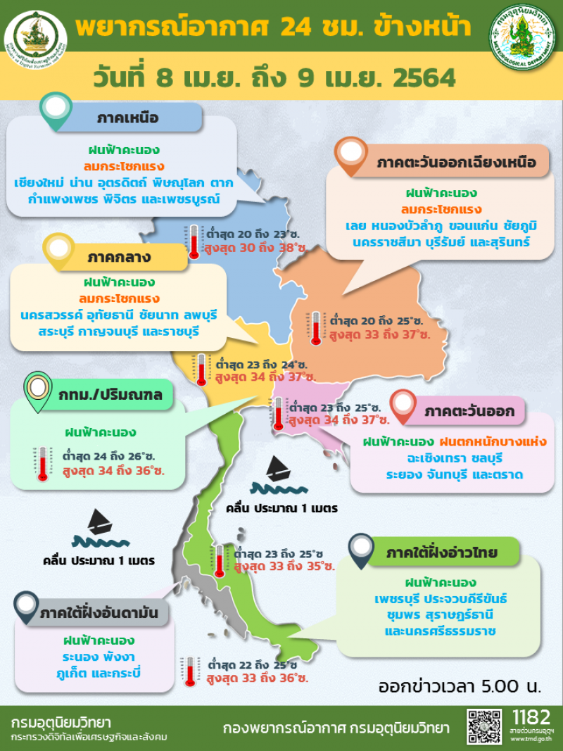 เมื่อวันที่ 8 เม.ย. กรมอุตุนิยมวิทยา พยากรณ์อากาศ 24 ชั่วโมงข้างหน้าว่า ความกดอากาศต่ำเนื่องจากความร้อนปกคลุมประเทศไทยตอนบน ลักษณะเช่นนี้ทำให้ประเทศไทยตอนบนจะมีอุณหภูมิสูงขึ้น โดยมีอากาศร้อนกับมีฟ้าหลัวในตอนกลางวัน