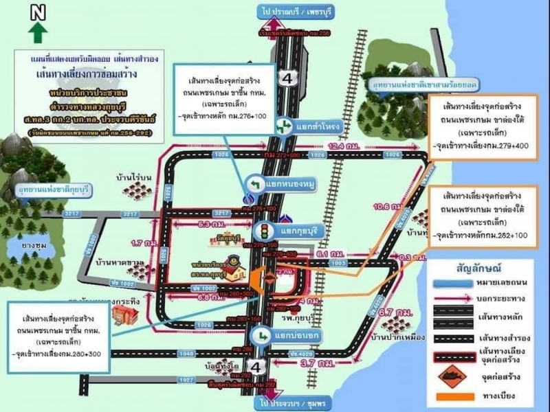 นายสุพจน์ เสริมทรัพย์ หัวหน้าหมวดทางหลวงประจวบคีรีขันธ์ กล่าวว่า ได้แจ้งประชาสัมพันธ์เส้นทางเลี่ยงให้ผู้ใช้รถใช้ถนนทราบ พร้อมจัดทำป้ายบอกทาง จัดเจ้าหน้าที่คอยอำนวยความสะดวกการจราจรตลอด 24 ชั่วโมง หากรถเดินทางมาจากถนนเพชรเกษมฝั่งขาล่องใต้ ให้ใช้เส้นทางสำรองที่ 1 เลี่ยงถนนเพชรเกษม เข้าซอยเพชรเกษม-เจดีย์ หลัก กม.279+600 ระยะทาง 1.6 ก.ม. ไปออกถนนเพชรเกษมที่ โรงเรียนบ้านบนหลัก กม.ที่ 280+400