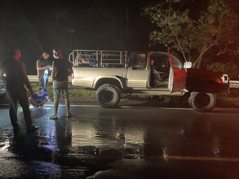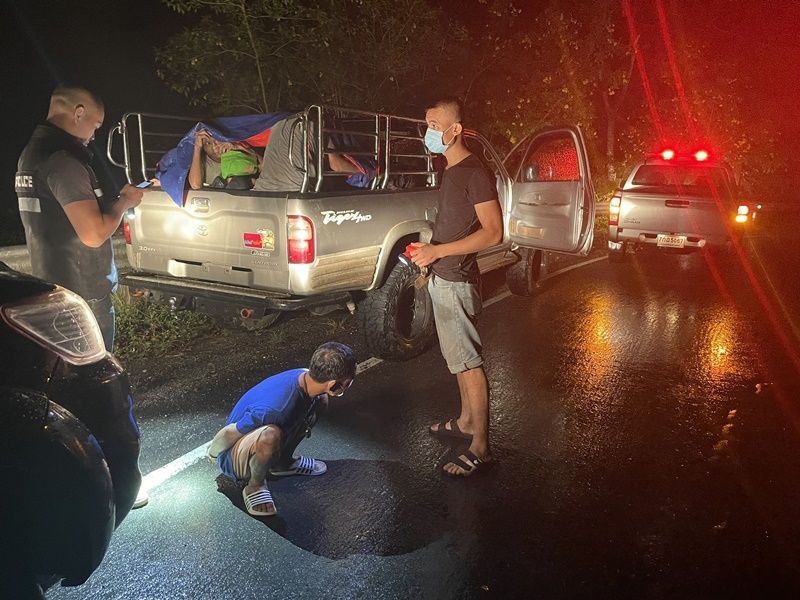 กระทั่งเวลาประมาณ 20.30 น. วันที่ 11 เม.ย. 64 ที่ผ่านมา ตนพร้อมด้วย พ.ต.ท.ธีรพร วิจิตรบรรณการ รอง ผกก.สส.สภ.ทองผาภูมิ พ.ต.ท.เกียรติศักดิ์ วิเศษสิงห์ รอง ผกก.ป.สภ.ทองผาภูมิ รับแจ้งจากสายลับว่า จะมีขบวนการลักลอบนำพาแรงงานชาวเมียนมาเข้ามาในราชอาณาจักรโดยผิดกฎหมาย มาจากชายแดนด้านอำเภอสังขละบุรี ด้วยการใช้รถกระบะ โตโยต้า ไทเกอร์ แคป สีเทา ทะเบียน บว 7205 กาญจนบุรี