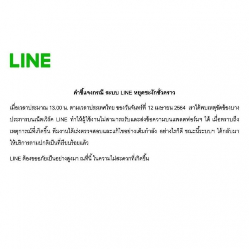 ล่าสุด ไลน์ ไทยแลนด์ ออกมาชี้แจงกรณีดังกล่าว โดยระบุว่า เมื่อเวลาประมาณ 13.00 น. ตามเวลาประเทศไทย ของวันจันทร์ 12 เม.ย.64 ได้พบเหตุขัดข้องบางประการบนเน็ตเวิร์คไลน์ ทำให้ผู้ใช้งานไม่สามารถรับและส่งข้อความบนแพลตฟอร์มได้ เมื่อทราบถึงเหตุการณ์ที่เกิดขึ้น ทีมงานได้เร่งตรวจสอบและแก้ไขอย่างเต็มกำลัง อย่างไรก็ดี ขณะนี้ ระบบได้กลับมาให้บริการตามปกติแล้ว