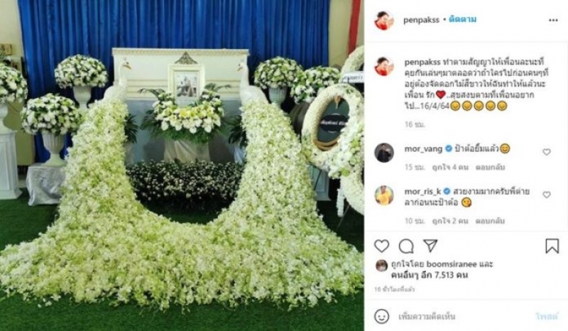 ต่าย เพ็ญพักตร์ ยังได้โพสต์สุดอาลัยถึงเพื่อนรักเป็นภาพที่หน้าศพเพื่อนรักประดับตกแต่งอย่างสวยงาม พร้อมทั้งเผยสุดเศร้าด้วยว่า ทำตามสัญญาให้เพื่อนละนะที่คุยกันเล่นๆมาตลอดว่าถ้าใครไปก่อนคนๆที่อยู่ต้องจัดดอกไม้สีขาวให้ฉันทำให้แล้วนะเพื่อน รัก..สุขสงบตามที่เพื่อนอยากไป16/4/64