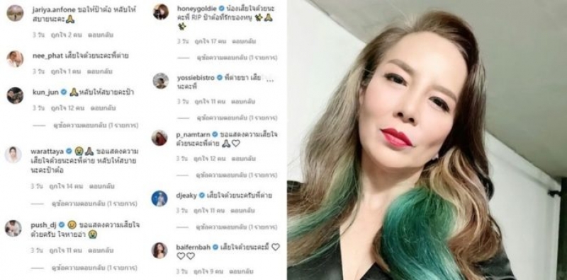 โดยมีคนบันเทิงจำนวนมากร่วมอาลัย อาทิ แหม่ม คัทลียา คอมเมนต์ด้วยว่า ยังไม่อยากจะเชื่อเลยค่ะ ขอให้ป้าต้อหลับให้สบายนะคะ นก จริยา ก็บอกว่า ขอให้ป้าต้อ หลับให้สบายนะคะ หน่อย บุษกร ร่วมอาลัยเช่นกันว่า หลับให้สบายคะป้า รวมทั้ง จุ๋ย วรัทยา , ดีเจพุฒ , ฮันนี่ ภัสสร , ใบเฟิร์น พิมพ์ชนก เป็นต้น