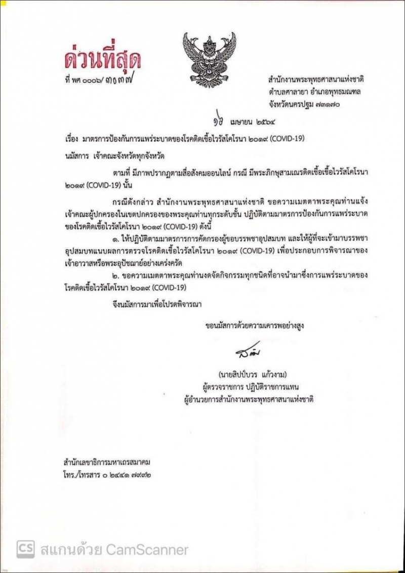 ล่าสุด(17 เมษายน 64 ) ทางด้าน สำนักงานพระพุทธศาสนาแห่งชาติ ออกหนังสือถึงเจ้าคณะจังหวัดทุกจังหวัดทั่วประเทศ ขอความร่วมมืองดจัดกิจกรรมทุกชนิด ที่อาจก่อให้เกิดการแพร่ระบาดของโควิด 19 ได้ อีกทั้งให้ปฏิบัติตามมาตรการป้องกันโรคคัดกรองอย่างเคร่งครัด โดยได้ระบุว่า
