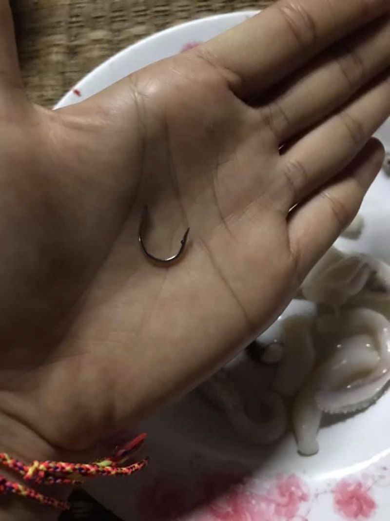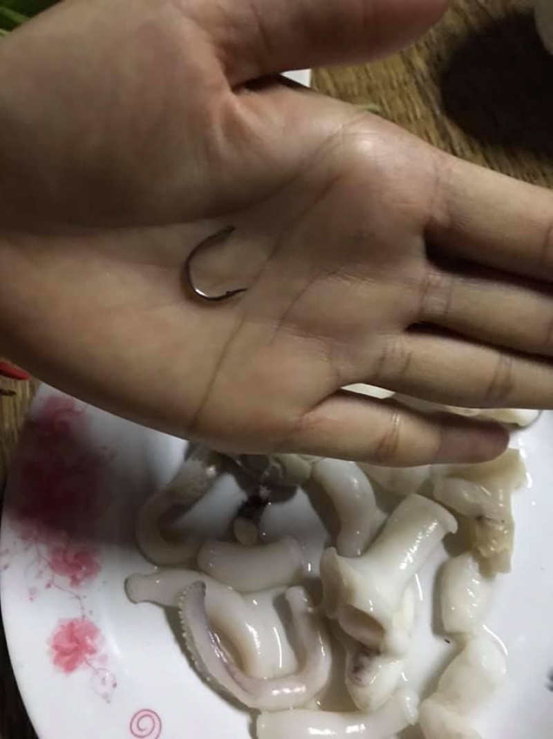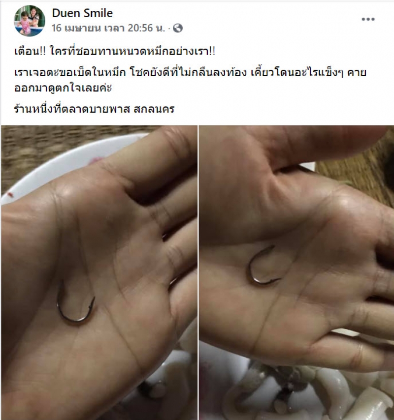 เป็นอีกหนึ่งเรื่องราวที่น่าสนใจ เมื่อผู้ใช้เฟซบุ๊กรายหนึ่ง ได้ออกมาโพสต์เตือนภัย พบเจอตะขอเบ็ดในตัวปลาหมึก ซึ่งต่อมา น.ส.ศรุดา เจ้าของเรื่อง เผยว่า วานนี้ (16 เม.ย. 64) ได้ฝากสามีซื้อหนวดหมึกกระดองใหญ่ที่ตลาดเย็นแห่งหนึ่งในเขตเทศบาลนครสกลนคร