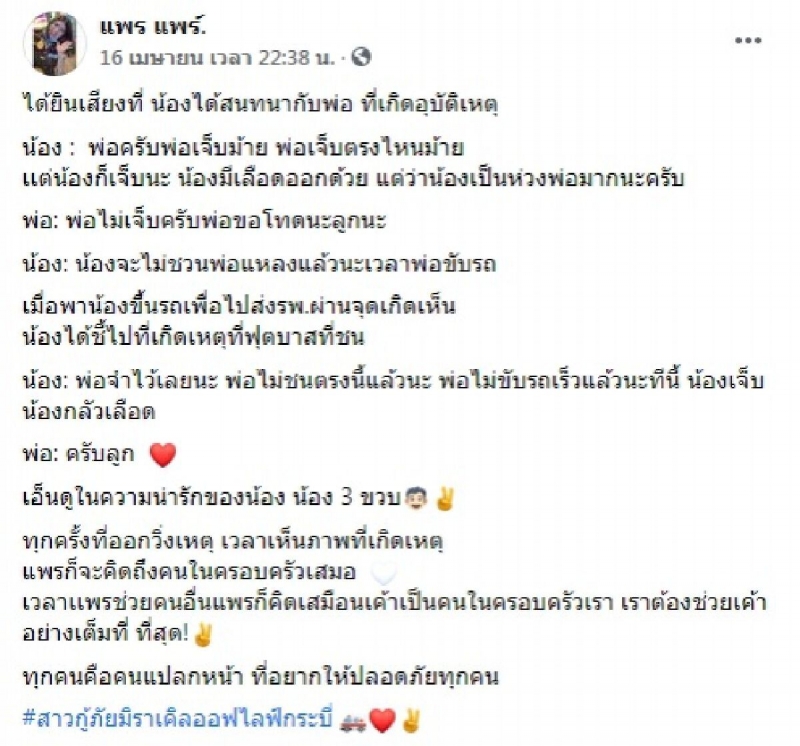 กลายเป็นโพสต์ที่มีชาวเน็ตแห่แชร์กันเป็นจำนวนมาก หลังผู้ใช้เฟซบุ๊กชื่อ "แพร แพร์." ได้โพสต์ภาพของสองพ่อลูกที่ได้รับบาดเจ็บจากอุบัติเหตุรถจักรยานยนต์ล้ม มีบาดแผลเต็มใบหน้าและร่างกาย โดยทั้งคู่ได้รับการช่วยเหลือจากทีมกู้ภัย ทั้งนี้ระหว่างนำผู้บาดเจ็บส่งโรงพยาบาล ลูกกับพ่อก็ได้พูดคุยกันซึ่งทำเอาเจ้าหน้าที่กู้ภัยที่ได้ยินถึงกับบอกน่าเอ็นดู