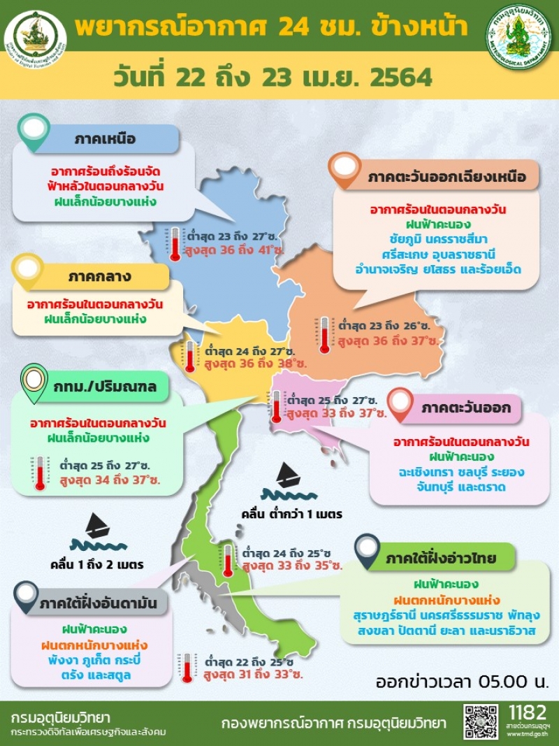 เมื่อวันที่ 22 เม.ย. 64 กรมอุตุนิยมวิทยา รายงานสภาพอากาศประจำวัน ลักษณะอากาศทั่วไปพยากรณ์อากาศ 24 ชั่วโมงข้างหน้า บริเวณประเทศไทยมีฝนฟ้าคะนองบางแห่ง กับมีอากาศร้อนถึงร้อนจัดในตอนกลางวัน เนื่องจากมีความกดอากาศต่ำเนื่องจากความร้อนปกคลุมประเทศไทยตอนบน ประกอบกับลมตะวันตกเฉียงใต้ยังคงพัดนำความชื้นจากทะเลอันดามันและอ่าวไทยเข้ามาปกคลุมภาคตะวันออกเฉียงเหนือ ภาคกลาง ภาคตะวันออก รวมทั้งกรุงเทพมหานครและปริมณฑล และภาคใต้ ขอให้ประชาชนบริเวณดังกล่าวระมัดระวังอันตรายจากฝนฟ้าคะนองไว้ด้วย