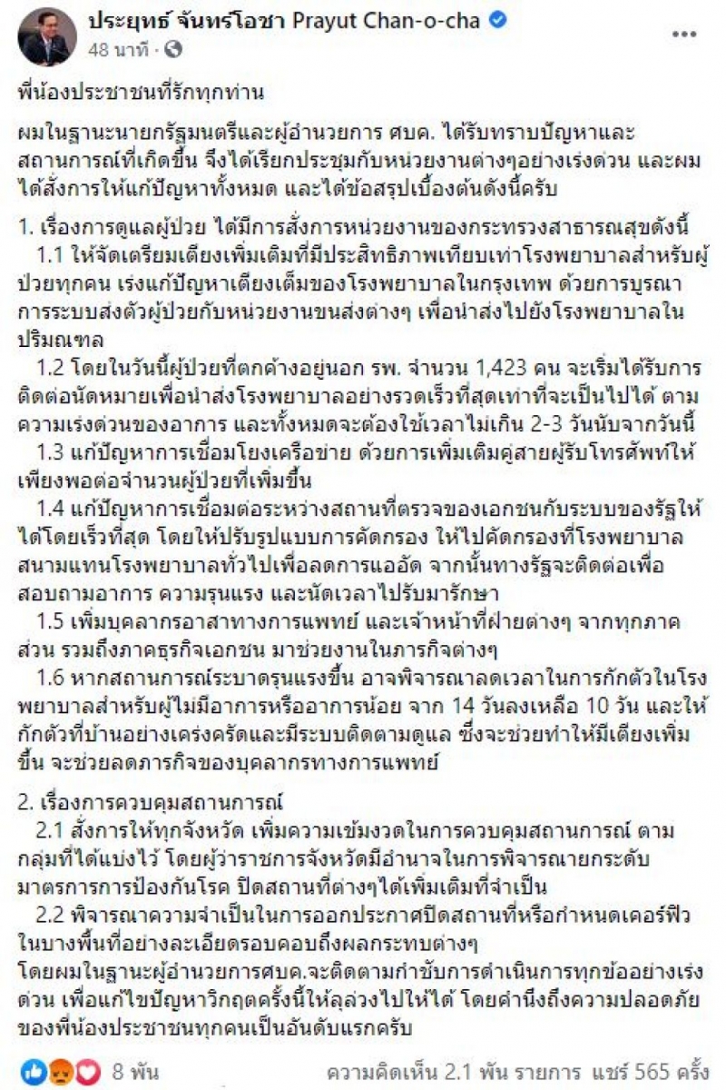วันที่ 24 เมษายน 2564 บนเพจเฟซบุ๊กของพล.อ.ประยุทธ์ จันทร์โอชา นายกรัฐมนตรี ได้โพสต์ผลประชุมศบค.ล่าสุด 2 หมวดใหญ่เพื่อรับมีการแพร่ระ บ า ด ของ โ ร ค โ ค วิ ด-19 โดยเน้นย้ำเรื่องการดูแลผู้ป่วยและการควบคุมสถานการณ์ ซึ่งทางนายกรัฐมนตรีได้โพสต์ว่า