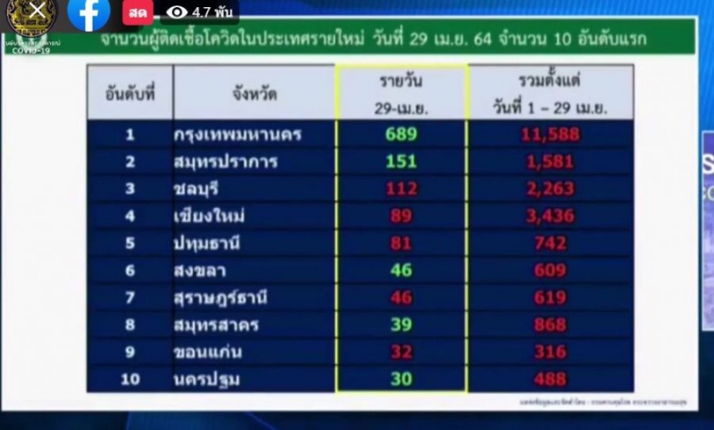 เบื้องต้น ตรวจสอบอัพเดท จากการแถลงข่าวศูนย์บริหารสถานการณ์ โ ค วิ ด -19(ศบค.) ประจำวันที่ 29 เมษายน 2564 รายงาน 10 จังหวัดอันดับพบผู้ ติ ด เ ชื้ อ โ ค วิ ด 19 สูงสุด