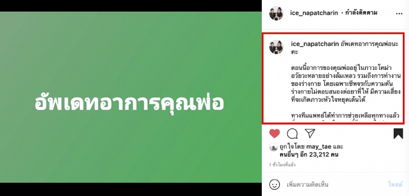 ต้องนับว่าเป็นข่าวที่ไม่ดีเท่าไหร่นัก เมื่อ สาวไอซ์ ณพัชรินทร์ หรือ ลูกสาวน้าค่อม ชวนชื่น ได้ออกมาโพสต์อินสตราเเกรมส่วนตัว อัพเดทอาการของคุณพ่อ ว่าตกอยู่ในสภาวะโคม่า จึงทำให้เหล่าพี่น้องในวงการบันเทิงนั้นออกมาส่งกำลังใจกันอย่างมากมาย