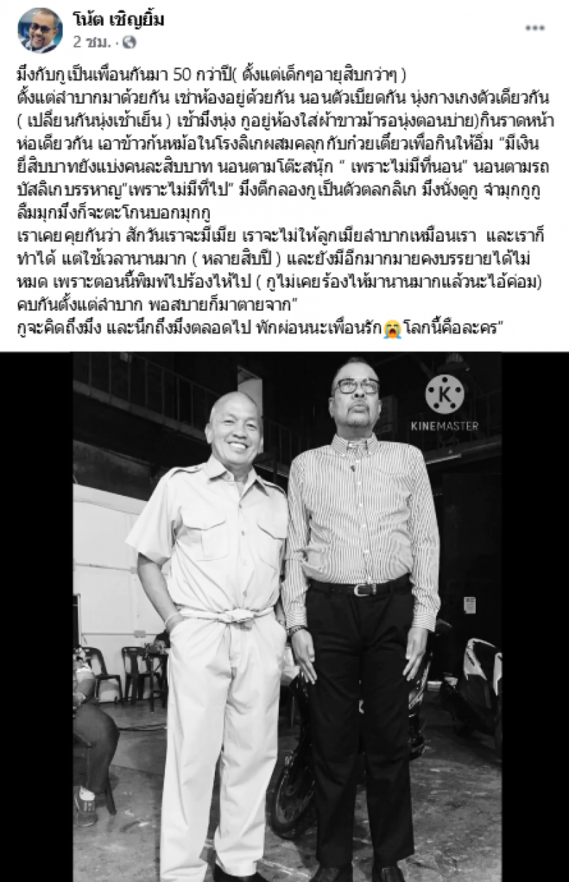 ทั้งนี้ ทางด้าน โน้ต เชิญยิ้ม ก็ได้โพสต์ภาพสุดเศร้าพร้อมเล่าถึงความหลังว่า มึงกับกูเป็นเพื่อนกันมา 50 กว่าปี( ตั้งแต่เด็กๆอายุสิบกว่าๆ )