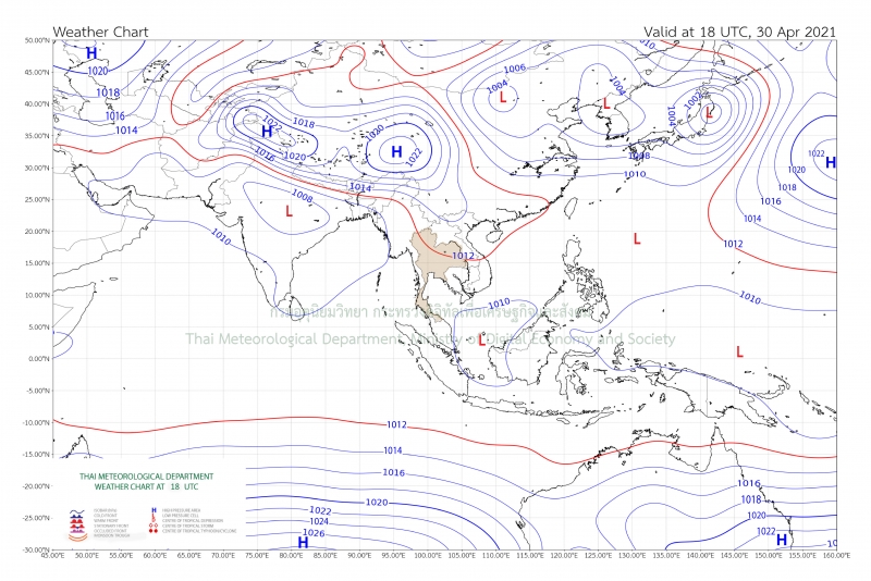 วันที่ 1 พฤษภาคม กรมอุตุฯ พยากรณ์อากาศ 24 ชั่วโมงข้างหน้า บริเวณความกดอากาศสูงจากประเทศจีนที่ปกคลุมภาคเหนือ ภาคตะวันออกเฉียงเหนือ ภาคกลางของประเทศไทย มีกำลังอ่อน ประกอบกับมีลมใต้และลมตะวันออกเฉียงใต้พัดปกคลุมบริเวณประเทศไทยตอนบน ทำให้บริเวณดังกล่าวยังคงมีฝนฟ้าคะนอง ลมกระโชกแรง