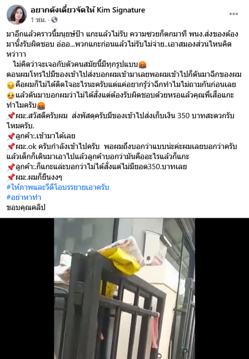 วันที่ 4 พฤษภาคม เฟซบุ๊กเพจ อยากดังเดี๋ยวจัดให้ Kim Signature ได้มีการลงเรื่องราวของหนุ่มพนักงานส่งของรายหนึ่ง ได้ไปส่งของเก็บเงินปลายทาง แต่ลูกค้าซึ่งเป็นผู้หญิงได้แกะของแล้ว แต่ไม่รับและไม่ยอมจ่ายเงิน โดยระบุว่า